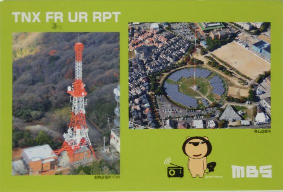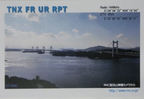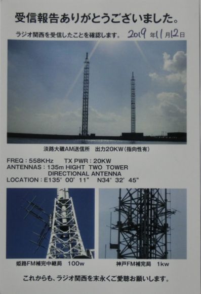 詳細画像 コールサイン(CallSign)JOCRエリア近畿バンド 周波数 発信局 出力AM 558kHz 淡路 20kW受信地神戸淡路鳴門自動車道 垂水JCT受信日時(DateTime)2019/11/04 16:38受信機AM 2号機SINPO Code35453コメント送信所からはそれなりに距離があったので走行中の受信は厳しかった。 交通情報の一部しか受信できなかったがベリカードを発行していただいた。種類AM |