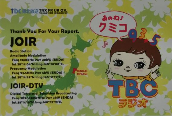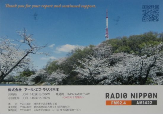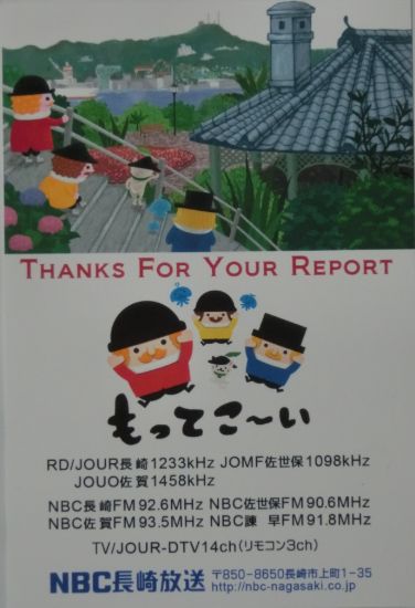 詳細画像 コールサイン(CallSign)JOURエリア九州・沖縄バンド 周波数 発信局 出力AM 1233kHz 長崎 5kW受信地雲仙市 小浜温泉受信日時(DateTime)2019/12/31 18:02受信機AM 3号機SINPO Code55555コメントベリカードと一緒にNBCの卓上カレンダーをいただいた。種類AM |