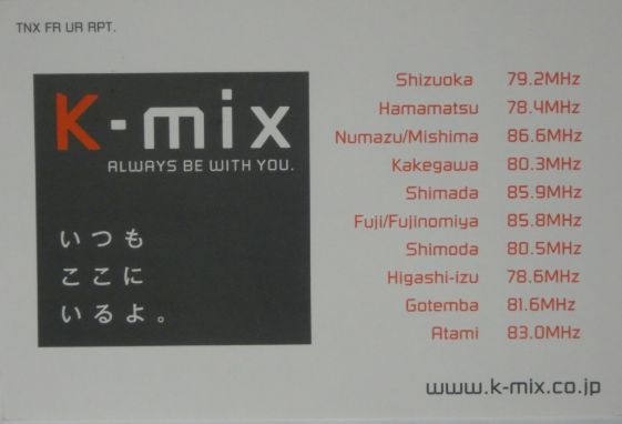 | 静岡エフエム放送 K-mix | JOKU-FM | 東海北陸 | FM 79.2MHz 静岡 1kW | 新東名高速道路 静岡SA | 45554 | 詳細 |