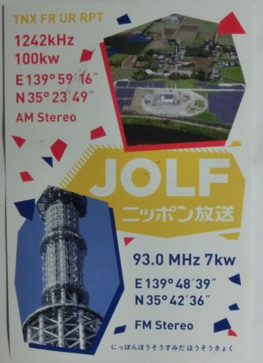 詳細画像 コールサイン(CallSign)JOLFエリア関東甲信越バンド 周波数 発信局 出力AM 1242kHz 木更津 100kW受信地中央自動車道 石川PA受信日時(DateTime)2019/10/22 16:16受信機AM 2号機SINPO Code44454コメントアンテナは自作のループアンテナを使った。種類AM |