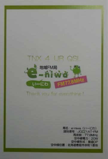 | e-niwa | JOZZ1AT-FM | 北海道・東北 | FM 77.8MHz 恵庭市 20W | 恵庭市 | 55555 | 詳細 |