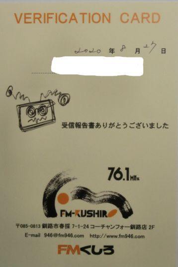 詳細画像 コールサイン(CallSign)JOZZ1AC-FMエリア北海道・東北バンド 周波数 発信局 出力FM 76.1MHz 釧路市 20W受信地釧路市受信日時(DateTime)2020/08/10 17:20受信機FM 2号機SINPO Code55555コメント種類コミュニティーFM |