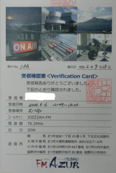 詳細画像 コールサイン(CallSign)JOZZ2AH-FMエリア北海道・東北バンド 周波数 発信局 出力FM 76.2MHz むつ市 20W受信地むつ市受信日時(DateTime)2020/05/06 12:59受信機FM 2号機SINPO Code55555コメント種類コミュニティーFM |